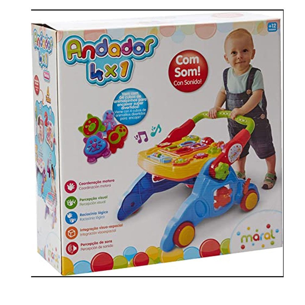 O andador infantil 4 em 1 de empurrar da Maral já vem com brinquedos sonoros e de encaixar educativos, pronto para desenvolter multiatividades que vai acompanhar o crescimento e o desenvolvimento da criança.