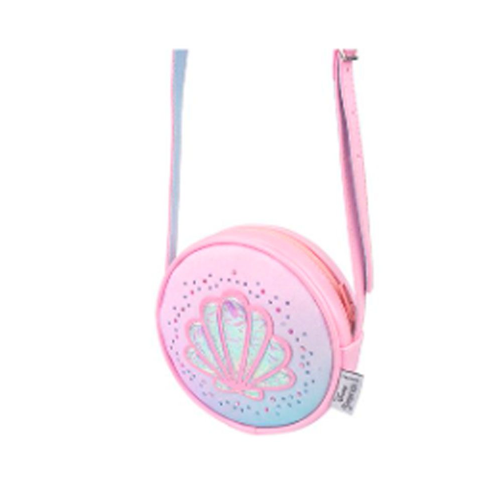 Bolsa infantil feminina em sintético rosa bale, frente em glitter degradê e concha holográfica, uma bolsa encantadora para todos os momentos! Parte frontal com aplicação hotfix de pedras strass dando brilho ao look sereia!