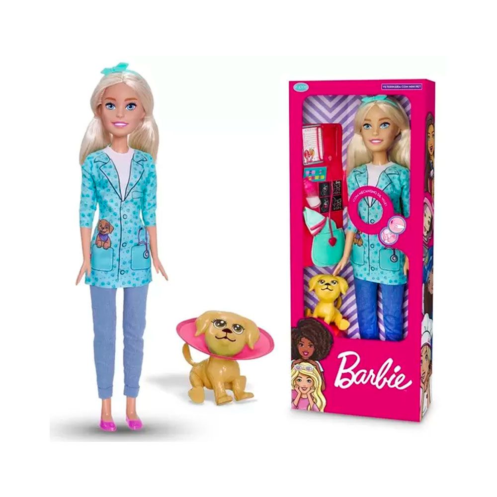 A última linha de bonecas Barbie Large Doll Veterinária com 12 Frases inclui 01 Boneca Large Doll, 01 Mecanismo de Voz, 01 Roupa com Tema de Veterinária, 01 Mini Pet, 01 Tiara, 01 Estetoscópio, 01 Seringa, 01 Cone Protetor, 01 Ficha para Informações de Animais, 01 Cartela com Raio x, 01 Mamadeira Mágica e 01 Cartela de Curativos.