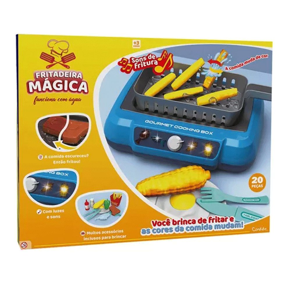 Fritadeira Mágica Candide Apresentamos a incrível Fritadeira Mágica Candide! Com ela, as crianças podem se divertir e aprender enquanto simulam o processo de dourar alimentos sem usar calor ou óleo. Basta adicionar água gelada ao compartimento apropriado, colocar os alimentos de brinquedo e ligar a fritadeira. As crianças vão adorar ver os alimentos ganhando uma cor dourada de maneira mágica e divertida. A Fritadeira Mágica é segura e fácil de usar, proporcionando horas de diversão criativa. Ela utiliza 4 pilhas AA (não inclusas) para o seu funcionamento, permitindo que as crianças vivenciem a experiência completa de brincar de cozinhar. Com a Fritadeira Mágica, as crianças podem desenvolver habilidades imaginativas, criativas e motoras enquanto se divertem em sua própria cozinha de brinquedo. Deixe que elas explorem e experimentem diferentes combinações de alimentos, estimulando sua criatividade e imaginação. Com a Fritadeira Mágica Candide, as crianças podem criar momentos divertidos de brincadeira e aprender sobre culinária de maneira segura e envolvente.