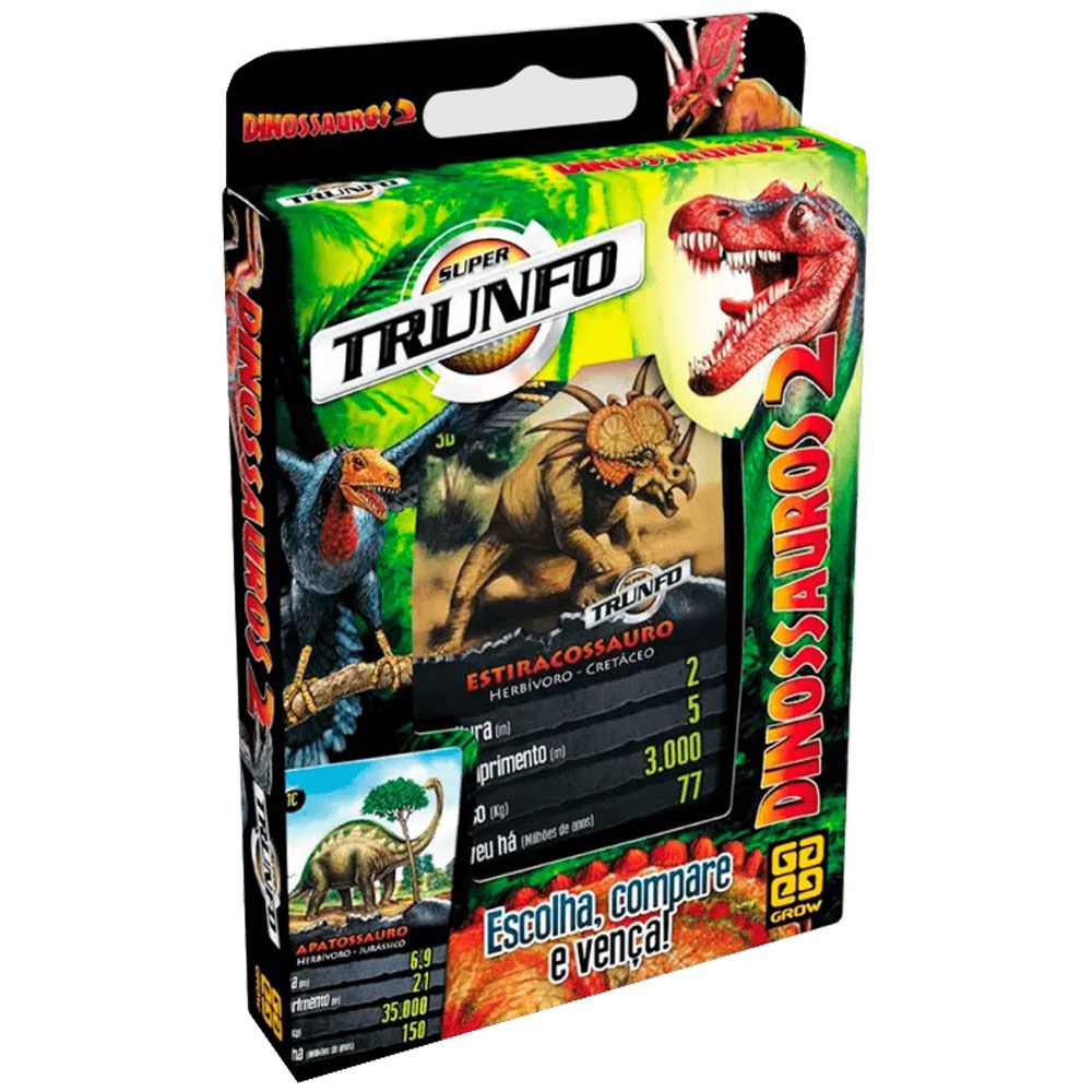 Super trunfo Dinossauros traz varias cartas com ilustrações e informações sobre os maiores seres vivos que já habitaram a terra.