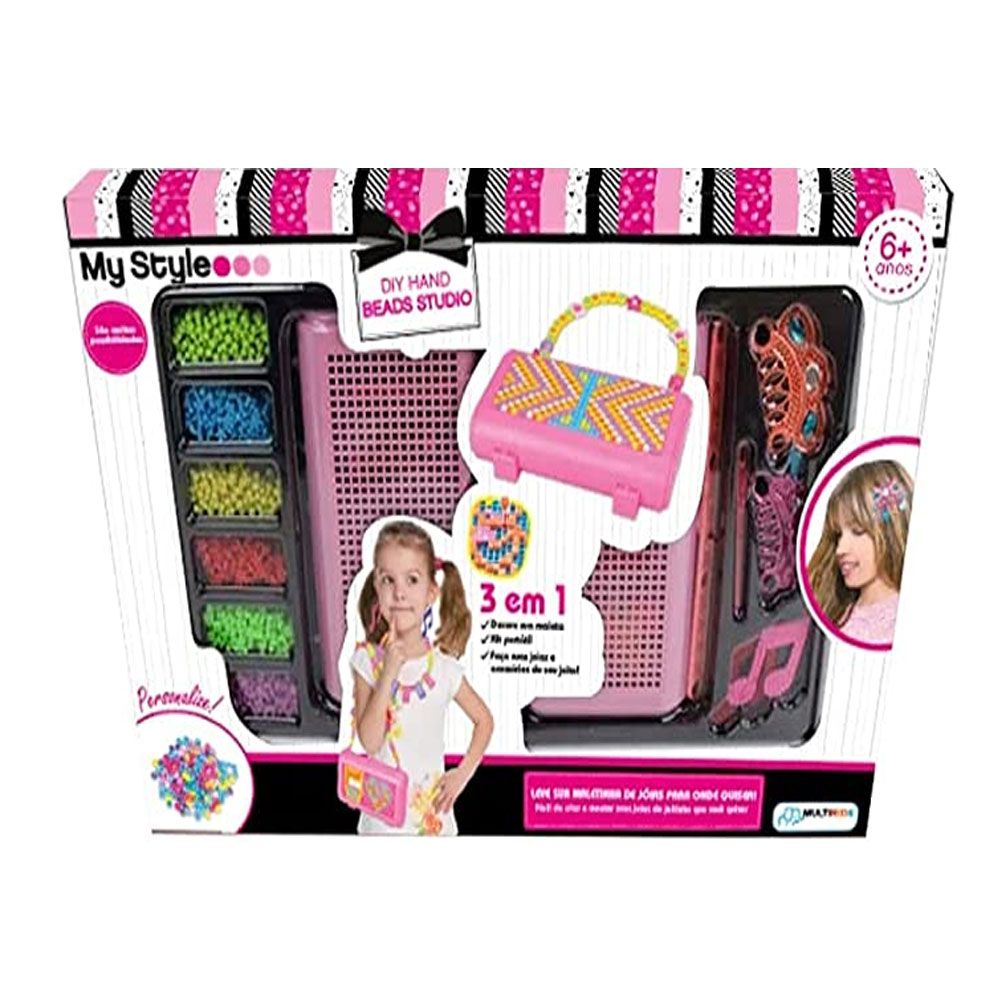 Fácil de montar e criar suas jóias do jeitinho que você quiser. Com o My Style Diy Hand Bag Beads você pode fazer brincos, arranjos, colares, enfeites e decorar sua própria bolsa com as miçangas. Use toda a sua criatividade!
