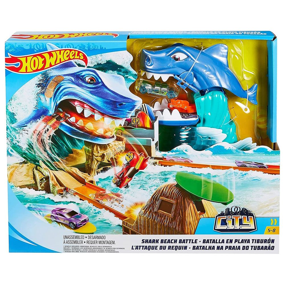 Solte a imaginação com este grande desafio para salvar a cidade do temível tubarão. Derrote o inimigo lançando um carro diretamente em suas mandíbulas. Fácil de montar, não possui peças soltas, e tem uma performance incrível! Construa uma cidade conectando outros conjuntos de Hot Wheels City.